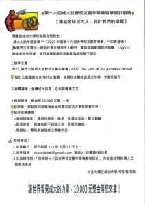 🔥第十六屆成大世界校友嘉年華會徽章設計徵稿🔥【連結全球成大人,設計我們的榮耀】🔥第十六屆成大世界校友嘉年華會徽章設計徵稿🔥 2 1 月, 2026 親愛的成功大學校友與在校師生: 成大人的年度盛事 **「2027年度第十六屆世界校友